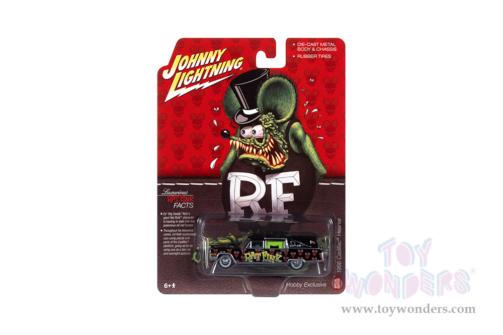 JLSP142/24 Round 2 Johnny Lightning - 1966 Cadillac® Hearse Rat Fink. 1:64 scale diecast collectible model. 6-car set. These cars are 3" long. Special Edition. 6 pcs/inner. Manufactured by Round 2. Each car individually blister carded. Card size: 5.5" x 7.5". Item JLSP142/24 is in Black with graphics.