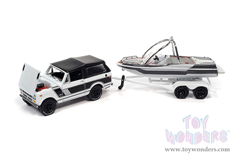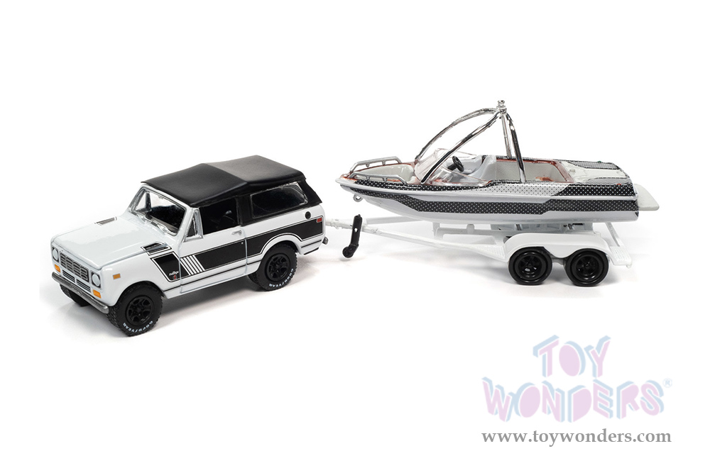 Round 2 Johnny Lightning - Hulls & Haulers Release 1 | International® Scout® II with Malibu Boat & Trailer (1979, 1/64 scale diecast model car, White w/Black Stripes, White & Black) JLSP205/24B