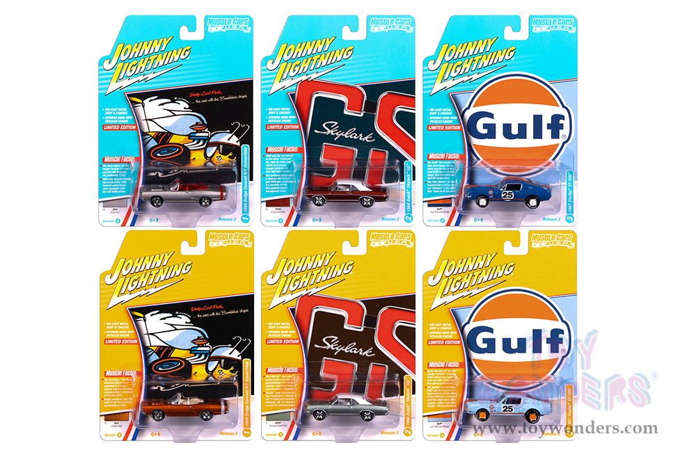 JLMC038/48 Round 2 Johnny Lightning - Muscle Cars U.S.A. 2025 Release 2. 1:64 scale diecast collectible model car. These cars are approx. 2.75" to 3.25" long, authentic factory colors, opening hoods on some models, 6-Car Set. Factory sealed case. Limited edition. Manufactured by Round 2. Each car individually blister carded. Card size: 6" x 7.25".