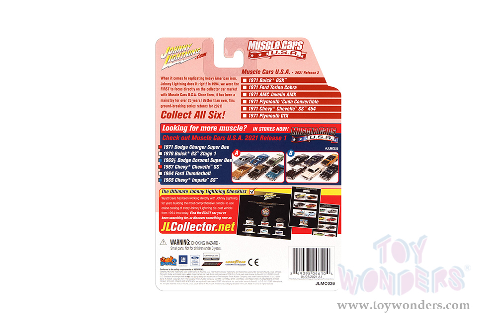 JLSP151/24B Round 2 Johnny Lightning - Muscle Cars U.S.A. | Buick® GSX Hardtop Class of 1971. 1:64 scale diecast collectible model. 6-car set. These cars are 2.75" long. Special Edition. 6 pcs/inner. Manufactured by Round 2. Each car individually blister carded. Card size: 5.5" x 7.5". Item JLSP151/24B is in Lime Mist Green with Black Stripes. Limited edition to 7298 pcs.