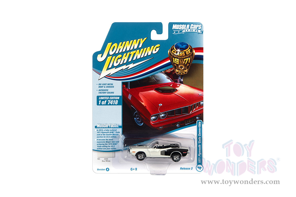 Round 2 Johnny Lightning - Muscle Cars U.S.A. | Plymouth Barracuda Convertible Class of 1971 (1971, 1/64 scale diecast model car, Snow White) JLSP153/24A