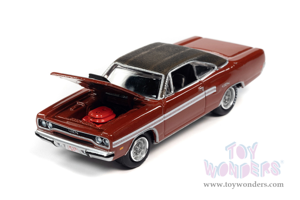 JLSP177/24B Round 2 Johnny Lightning - Muscle Cars U.S.A. | 1970 Plymouth GTX. 1:64 scale diecast collectible model. 6-car set. These cars are 3" long. Special Edition. Opening hood. 6 pcs/inner. Manufactured by Round 2. Each car individually blister carded. Card size: 5.5" x 7.5". Item JLSP177/24B is in Burnt Orange w/Gator Grain Chocolate Brown Roof White Dual Side Stripes. Limited edition to 8788 pcs.
