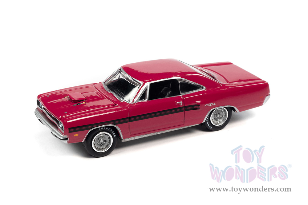 Round 2 Johnny Lightning - Muscle Cars U.S.A. | Plymouth GTX (1970, 1/64 scale diecast model car, Moulin Rouge w/Black Dual Side Stripes) JLSP177/24A