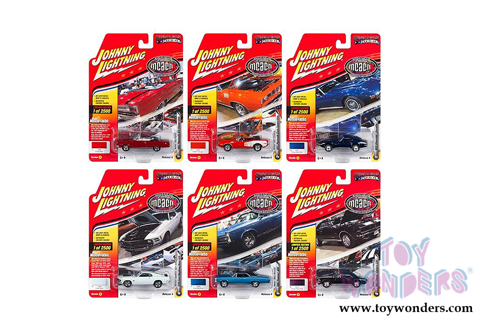 JLMC016/48A Round 2 Johnny Lightning - Muscle Cars USA 2018 Release 4 Set A. 1:64 scale diecast collectible model car. These cars are approx. 3" long, authentic factory colors, opening hoods, 6-Car Set, factory sealed case and limited edition. GM is a trademark of the General Motors Corporation. Manufactured by Round 2. Each car individually blister carded. Card size: 5.5" x 7.5".