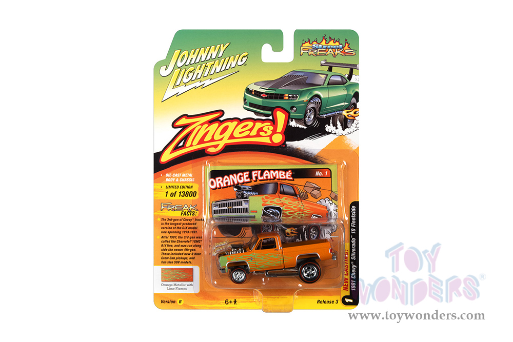 Round 2 Johnny Lightning - Street Freaks 2021 Release 3 Set A | Chevrolet® Silverado 10 Fleetside - Zingers! (1981, 1/64 scale diecast model car, Metallic Orange with Lime Flames) JLSP178/24B