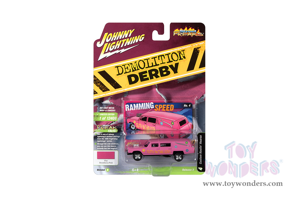 Round 2 Johnny Lightning - Street Freaks 2021 Release 3 Set A | Custom Haulin' Hearse - Demolition Derby (1/64 scale diecast model car, Flat Strawberry Pink) JLSP180/24A