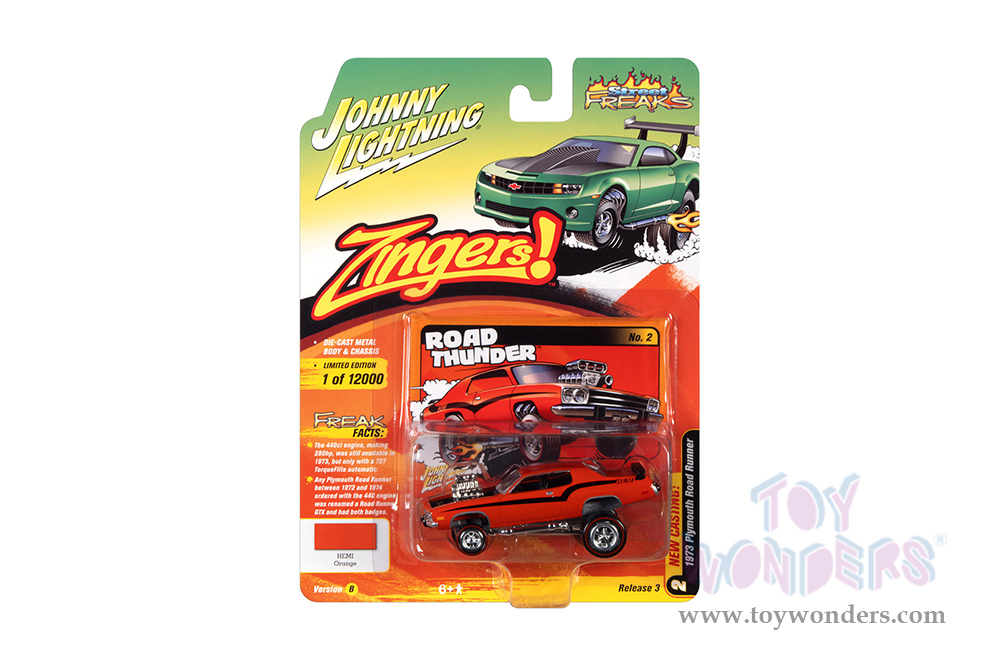 JLSP182/24B Round 2 Johnny Lightning - Street Freaks 2021 Release 3 Set B | 1973 Plymouth Road Runner - Zingers! 1:64 scale diecast collectible model car. These cars are 3" long, authentic factory colors, 6-Car Set, factory sealed case and limited edition.  Manufactured by Round 2. Each car individually blister carded. Card size: 6" x 7.25". Only 12,000 per car produced.