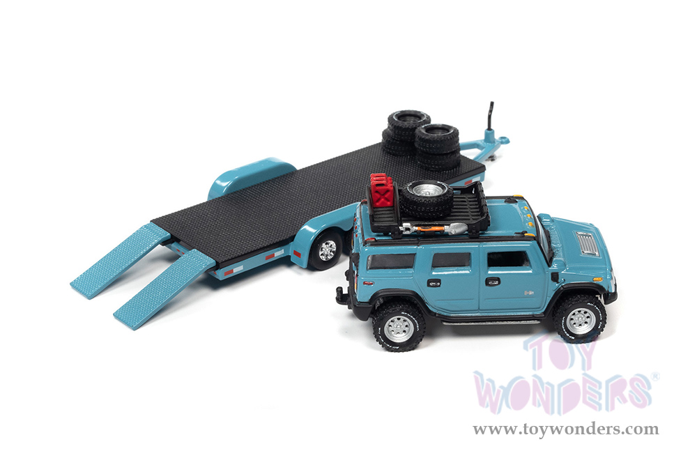 Round 2 Johnny Lightning - Truck and Trailer Release 1 | Hummer® H2 with Open Car Trailer (2004, 1/64 scale diecast model car, Custom Ocean Blue) JLSP202/24B