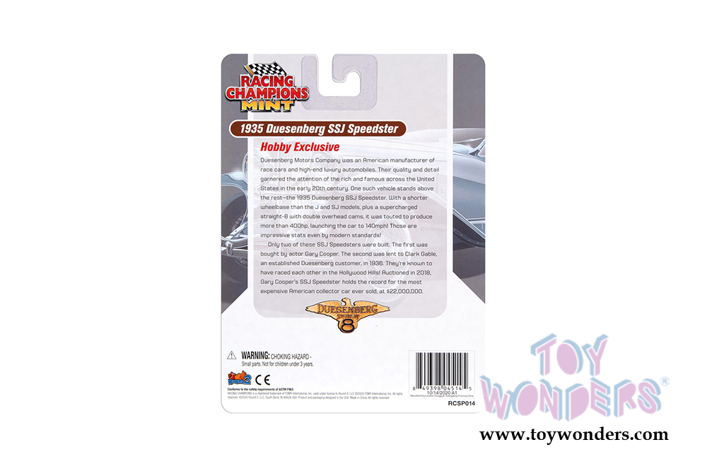 RCSP014/24 Round 2 Racing Champions Mint - 1935 Duesenberg SSJ Speedster. 1:64 scale diecast collectible model. 6-car set. These cars are about 2.75" long, authentic factory colors, diecast metal body. Detailed chassis and detailed interiors. 6 pcs/inner. Manufactured by Round 2. Each car individually blister carded. Card size: 5.5" x 7.5". Item RCSP014/24 is in Light Gray with Dark Gray.