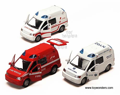 1106SL SOS Emergency Team with IC sound and lights. This 5.25" diecast metal has pullback action and comes in 3 assorted styles ambulance vehicles. Fire rescue, ambulance, and NY ambulance services. SUVs comes in assorted colors with 4 different siren sounds, flashing lights, and openable doors and trunk. 12 pcs per display box. 24 pcs per inner box.