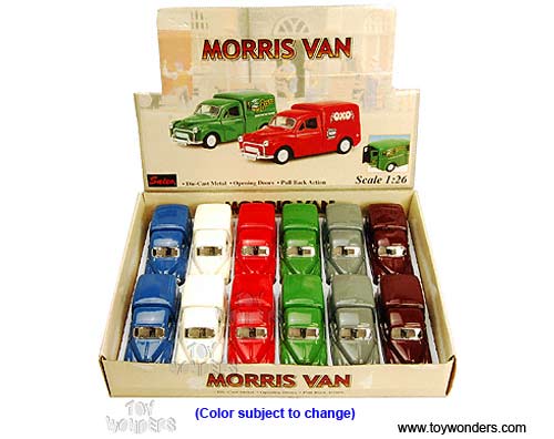 DP5031DH Saico - Morris Van. 5.25" die cast van with openale side doors & back doors, pull back motor action. This Morris van is manufactured by Saico. 12 pcs per display box in assorted colors. 48 pcs per inner box. Compared to most other diecast cars we carry, this particular piece has probably the most diecast metal in it for its size; heavy piece. Z8