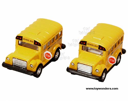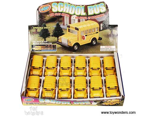 93282 School Bus. This is a 3.75" diecast metal pullback yellow school bus with openable doors and movable stop sign. 12 pcs per display box. 72 pcs per inner box.