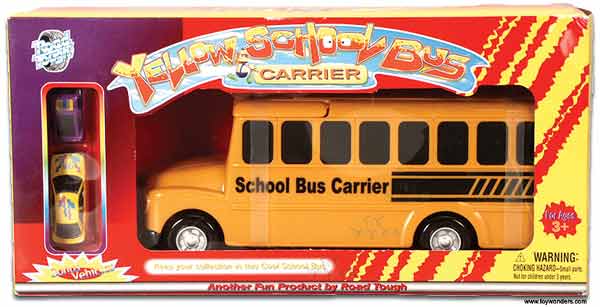 98535 School bus carrier 13" in length. Features carrying handle, loading ramp and drop-in tray. Stores toy vehicles. Includes 2 bonus toy vehicles.
