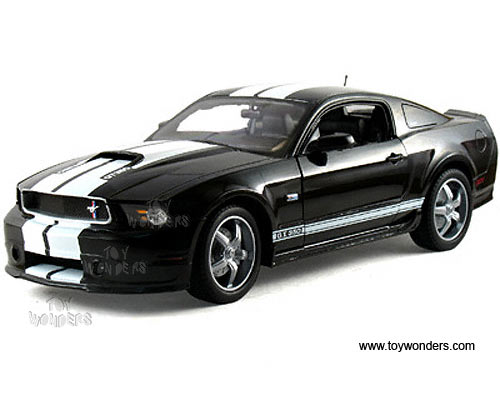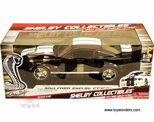 DC11834 Shelby - 2011 Ford Shelby GT350 Hard Top. 1:18 scale diecast collectible model car. This Ford Shelby GT-350 is a 10.25"L x 4"W x 3"H die cast metal car with openable doors, hood and trunk. Mounted on a display platform. This 2011 Ford Shelby GT350 is manufactured by Shelby Collectibles, Inc. Individually packed in a window box. Box size: 12.5"L x 5.75"W x 5"H. DC11834 is in BLACK color with White stripes.