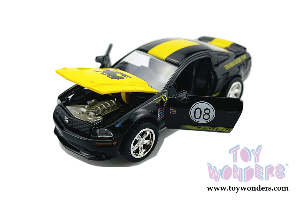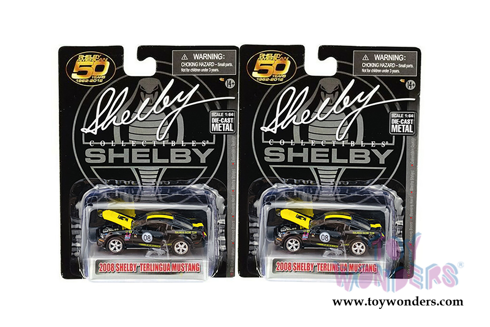 SC753BK Shelby - Shelby® 50th Anniversary 2008 Ford Shelby Mustang #08 Terlingua Racing Team. 1:64 scale diecast collectible models. These cars are 2.75" long die-cast metal car. Opening hood and doors. Detailed interiors, exteriors. Each car Individually blister carded. Card size: 7.5" x 6". Manufactured by Shelby Collectibles. Item SC753BK is in Black with Yellow stripes.