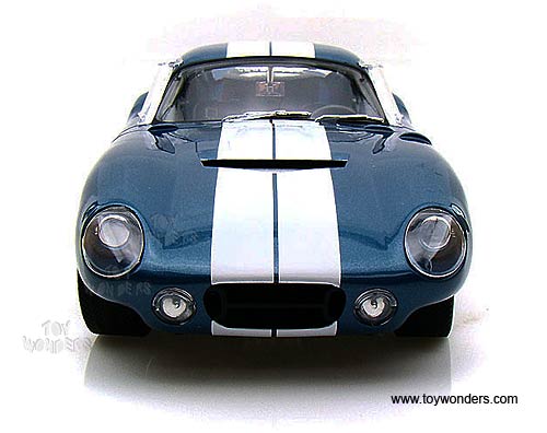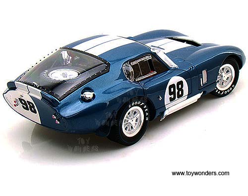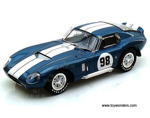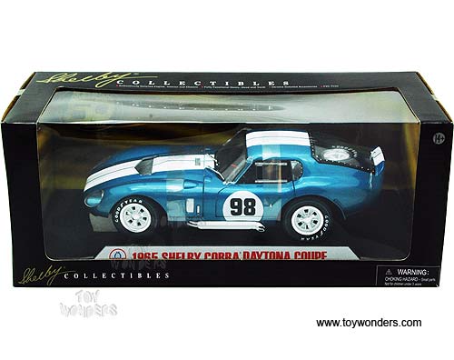 SC130BU Shelby - 1965 Shelby Cobra Daytona Coupe Hard Top #98. 1:18 scale diecast collectible model car. This Shelby Cobra Daytona is an 8.75"L x 3.5"W x 2.25"H die cast metal car with openable doors, hood & trunk, authentically detailed engine, interior and chassis, chrome detailed accessories, and PVC tires. Mounted on a display platform. Individually packed in a window box. Box size: 12.5"L x 5.75"W x 5"H. SC130BU is in BLUE color with White stripes.