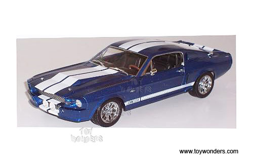 DC500BUW SHELBY COLLECTIBLES - 1967 Shelby Mustang GT 500E Hard Top. 1:18 scale diecast collectible model car. This GT500E is a 10"Lx 3.25"Wx 2.75"H die cast metal car with openable doors, hood & trunk. Mounted on a display platform. Individually packed in a window box. Box size: 14.25"Lx 7"Wx 6.25"H. DC500BUW in BLUE color with White stripes.   "The Shelby G.T. 500E is the most powerful production Shelby G.T. 500. Equipped with a 427 cubic inch Shelby aluminum racing engine that produces 525 horsepower. Also available with a supercharger that produces over 700 horsepower. Recently the Shelby has become a well known and popular car by children and adults alike. A performance car made for the thrill seekers need for speed and brut power. The mere sight of this car says it all."   Case pack: 6 pcs. Price quoted is for 1 pcs.