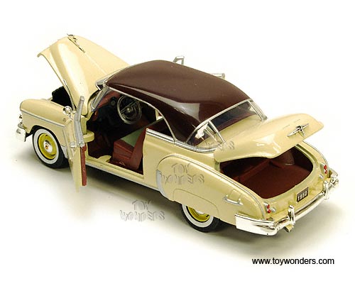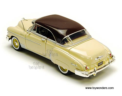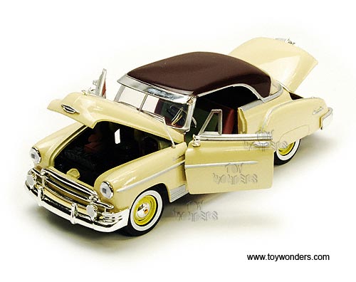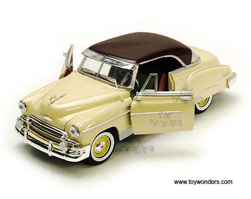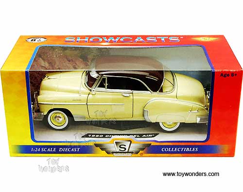 73268 Showcasts - 1950 Chevy Bel Air Hard Top. 1:24 scale diecast collectible model car. This Chevrolet Belair is an 8"Lx 3"Wx 2.5"H die cast metal car with free wheeling, steerable front wheels, and openable doors, hood & trunk. Individually packed in a window box WB. Box measures 9.75"Lx 4.5"Wx 4"H. The Chevy Belair is manufactured by Motor Max (Motormax). 73268 is in YELLOW color with brown roof. GM is a trademark of the General Motors Corporation.