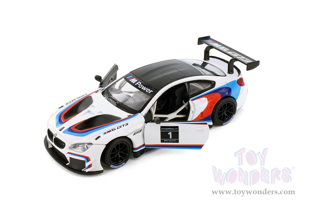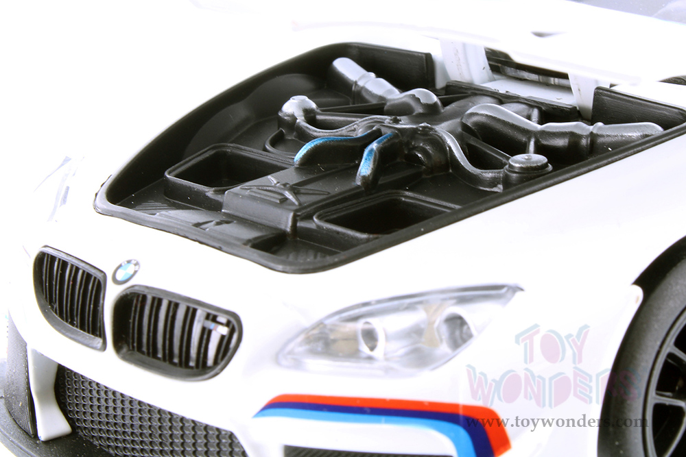 68255W Showcasts® Collectibles - BMW M6 GT3 #1. 1:24 scale diecast collectible model car. This BMW is an 8.25"L x 3.5"W x 2"H die-cast metal car with freewheeling, steering wheel. Openable doors and hood. 68255W is in white. Individually packed in a window box. Box size: 9.75"Lx 4.25"Wx 4"H.