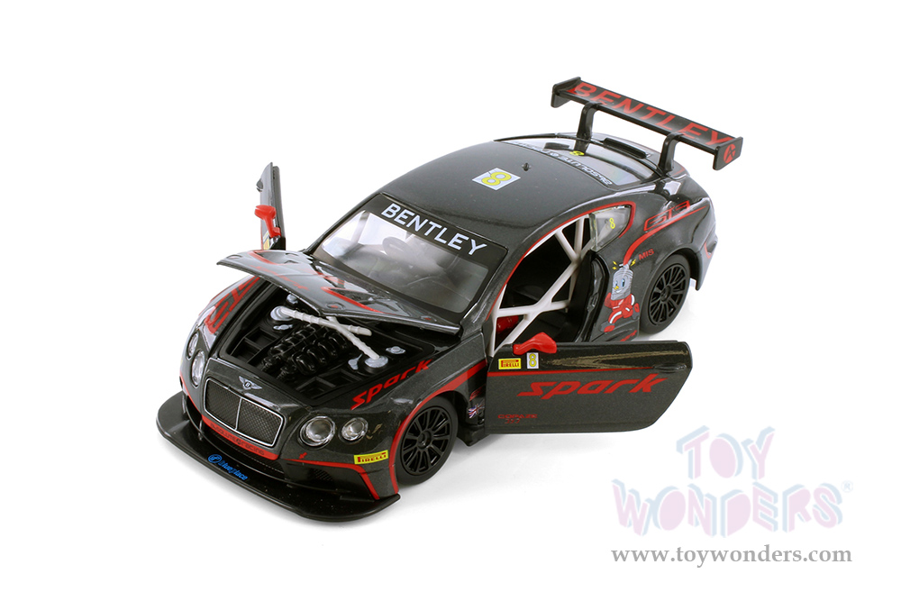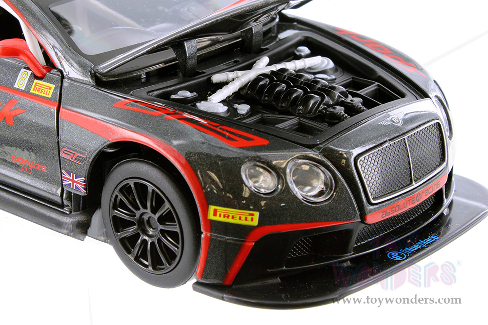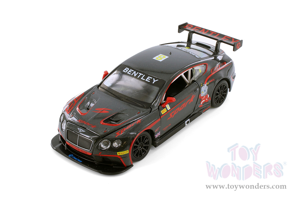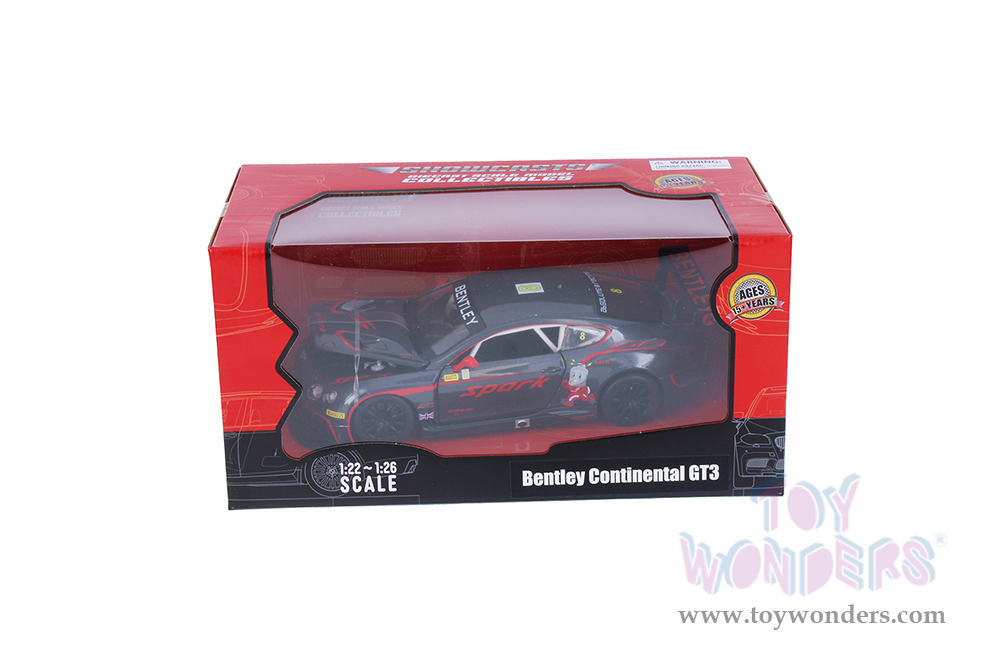 68267GY Showcasts® Collectibles - Bentley Continental GT3 Concept. 1:24 scale diecast collectible model car. This Bentley Continental is a 7.75"L x 3.25"W x 2"H die-cast metal car with freewheeling, openable doors and hood. 68267GY is in gray. Individually packed in a window box. Box size: 9.75"Lx 4.25"Wx 4"H.