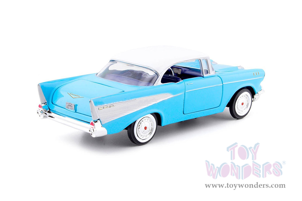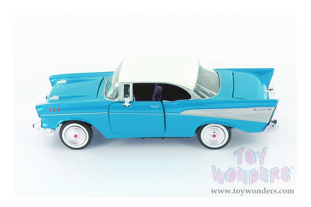 73228AC/BU Showcasts Collectibles -1957 Chevrolet® Bel Air Hard Top. 1:24 scale diecast collectible model car. This 1957 Chevrolet® Belair is an 8.25"L x 3"W x 2.5"H diecast metal with openable doors, hood & trunk, workable steering, and free wheels. This 57 Chevy® Bel-Air is manufactured by Motor Max Toys for Showcasts Collectibles. 73228AC/BU is in Blue color with White roof. Individually packed in a window box WB. Box size: 9.75"Lx 4.3"Wx 4"H. GM is a trademark of the General Motors Corporation.