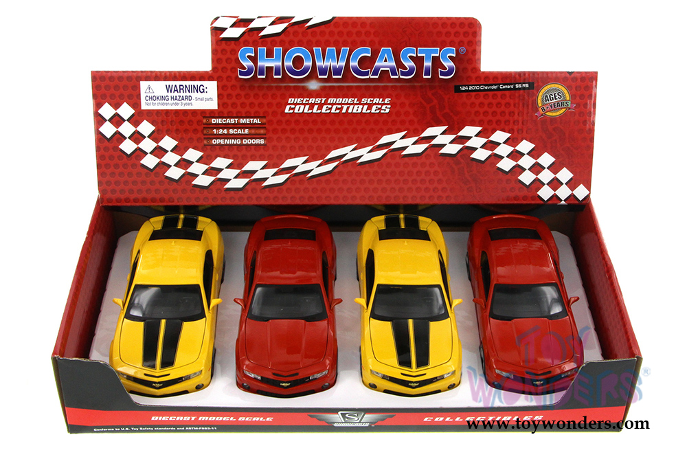 34207 Showcasts Collectibles - 2010 Chevrolet Camaro Hard Top. 1:24 scale diecast collectible model car. This Chevrolet Camaro is an 8"L x 3"W x 2.25"H die cast car with openable doors and hood. 4 pcs per display box in assorted colors. The Chevy Camaro is manufactured by Maisto for Showcasts Collectibles. GM is a trademark of the General Motors Corporation.