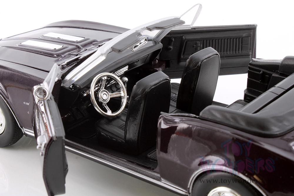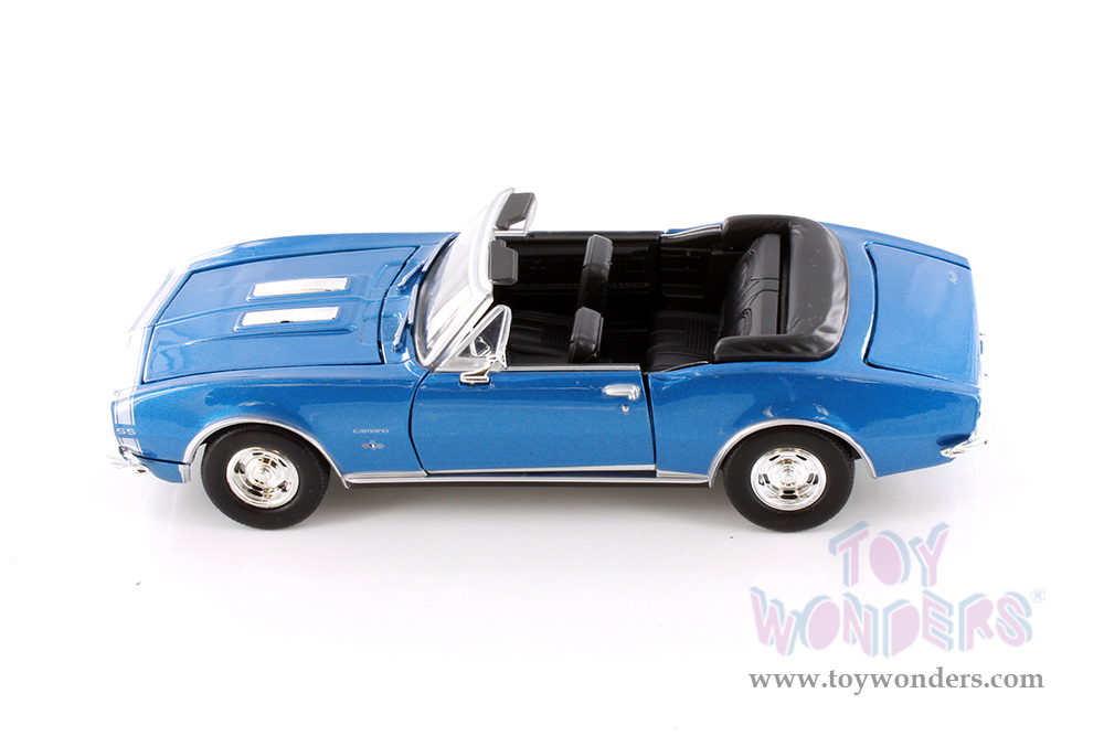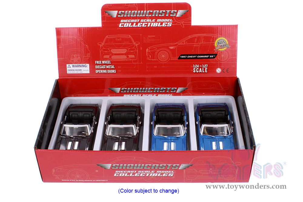 77301D Showcasts® Collectibles - 1967 Chevy® Camaro® SS™ Convertible. 1:24 scale diecast collectible model car. This Chevy® Camaro® is a 7.5"L x 3"W x 2"H die cast metal car with workable steering, freewheeling, openable hood, doors, and trunk. 4 pcs per display box in blue. GM is a trademark of the General Motors Corporation.