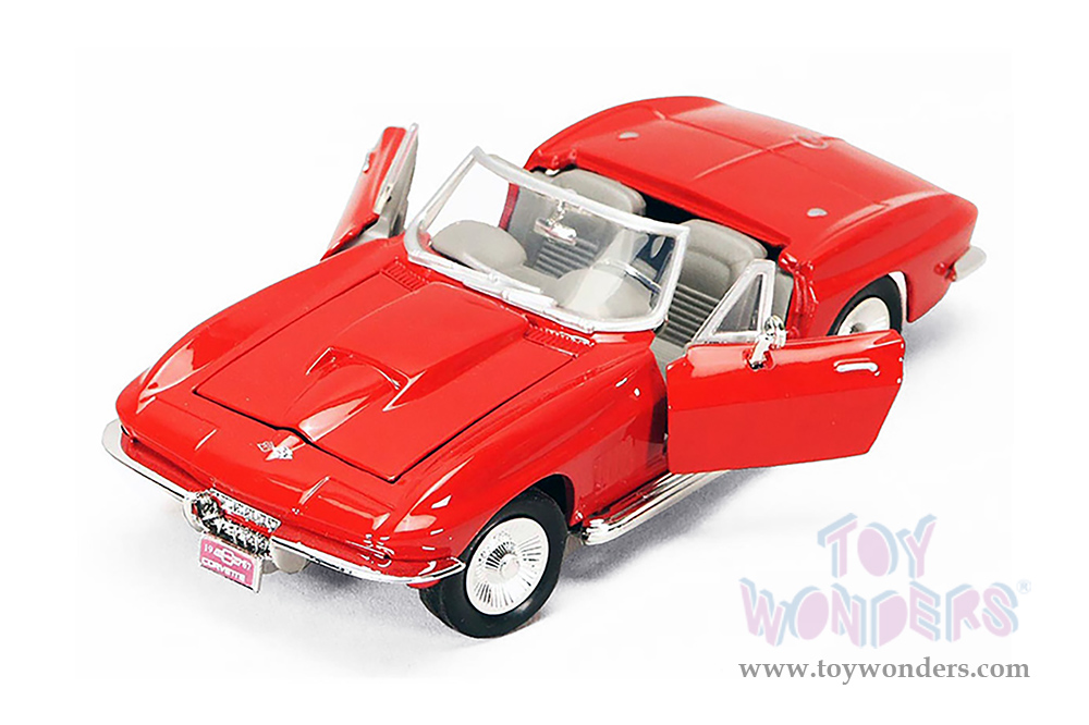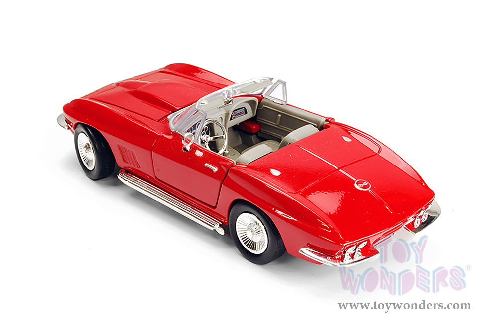 77224AR Showcasts® Collectibles - 1967 Chevrolet® Corvette® Convertible. 1:24 scale diecast collectible model car. This Chevy® Corvette® is a 7.25"L x 3"W x 2"H diecast metal classic car with workable steering, freewheeling, openable doors and hood. 77224AR is in red with gray interior. Individually packed in a window box. Box size: 9.75"Lx 4.25"Wx 4"H. GM is a trademark of the General Motors Corporation.