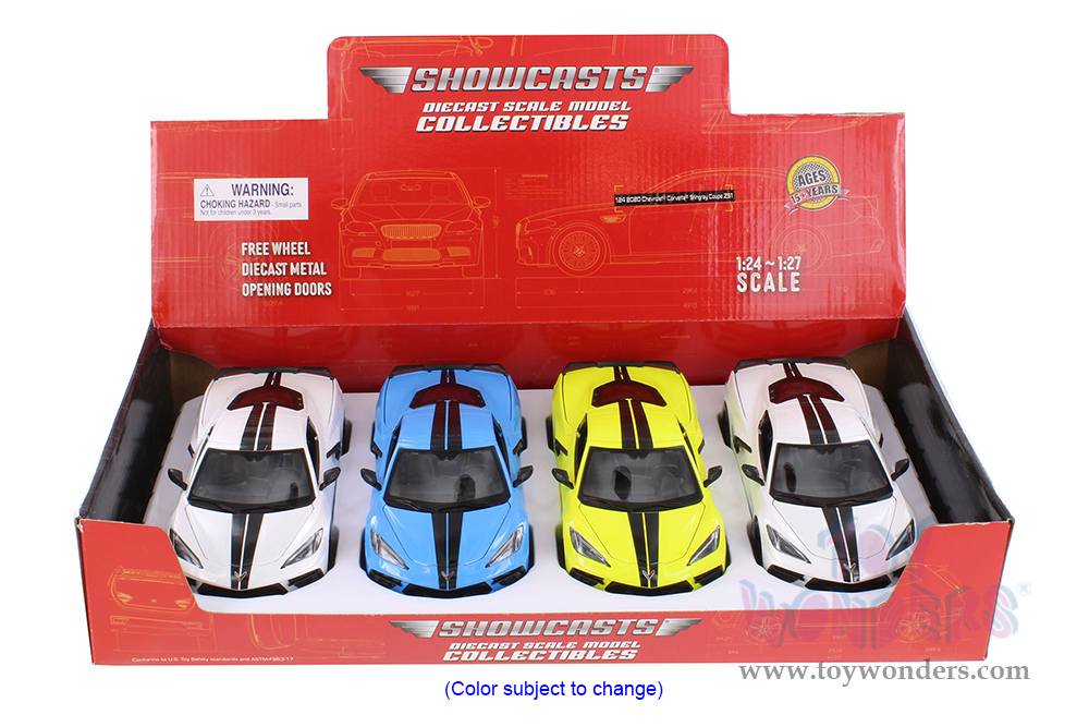 37527/3 Showcasts® Collectibles - 2020 Chevrolet® Corvette® Stingray Coupe Z51 Hardtop. 1:24 scale diecast collectible model car. This Chevy® Corvette® is a 7.5"L x 3.25"W x 2"H diecast metal with freewheeling, openable doors. 4 pcs per display box in assorted colors. GM is a trademark of the General Motors Corporation.