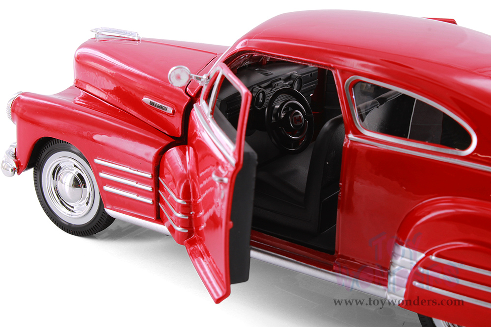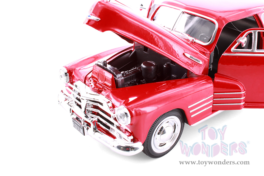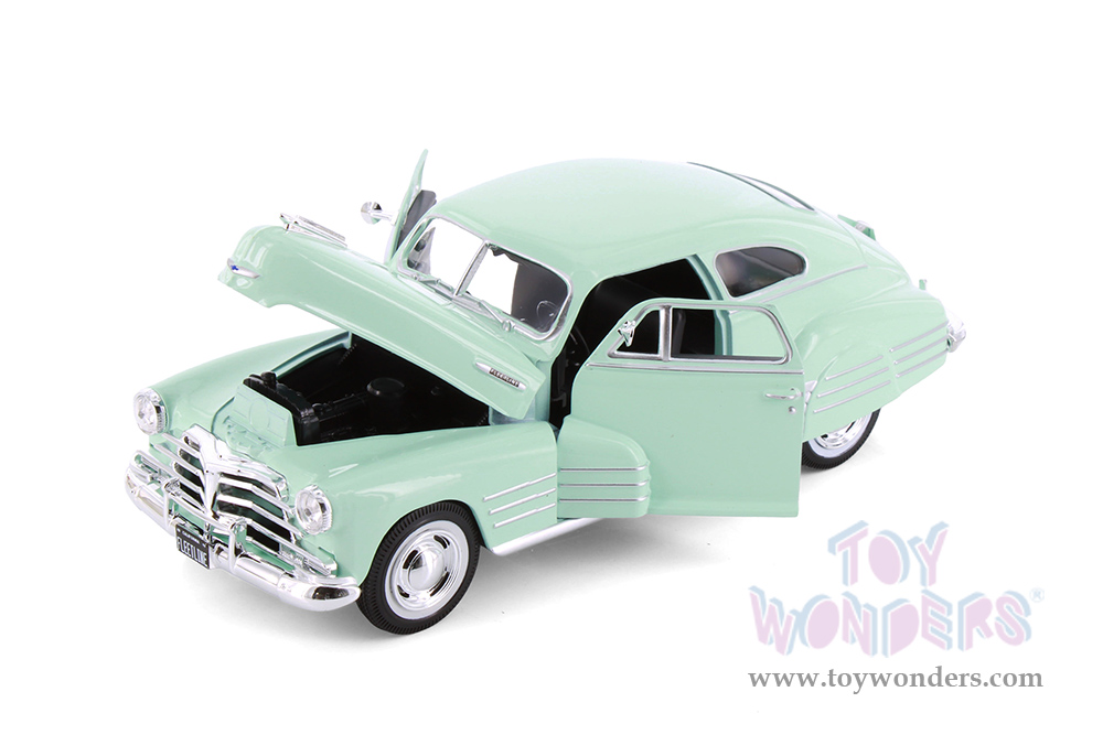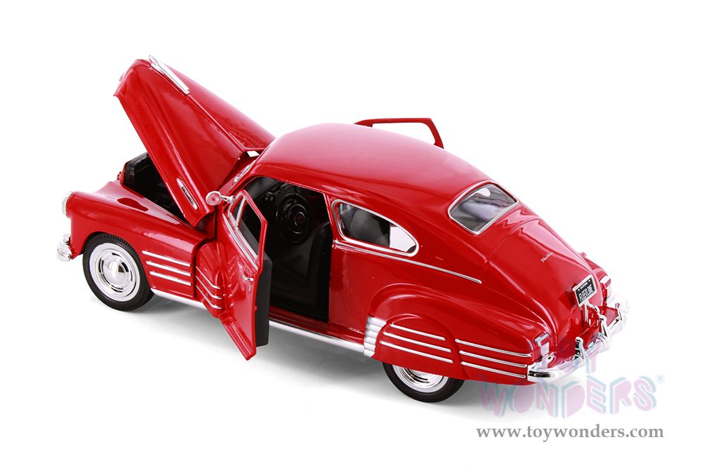 37921 Showcasts® Collectibles - 1948 Chevrolet® Fleetline Aerosedan. 1:25 scale diecast model car. This Chevrolet® is an 8"L x 3"W x 2.5"H diecast metal with freewheeling, steerable front wheels, openable doors and hood. 4 pcs per display box. 37921 is in assorted colors. GM is a trademark of the General Motors Corporation.