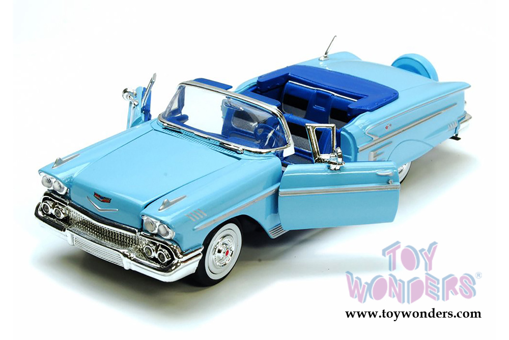 73267AC/BU Showcasts Collectibles - 1958 Chevrolet Impala Convertible. 1:24 scale diecast collectible model car. This Chevy Impala is an 8.75"L x 3.5"W x 2"H diecast metal car with freewheeling, steerable front wheels, and openable doors, hood, and trunk. Individually packed in a window box. Window Box measures 9.75"L x 4.5"W x 4"H. Manufactured by Motor Max for Showcasts Collectibles. 73267AC/BU is in BLUE color.