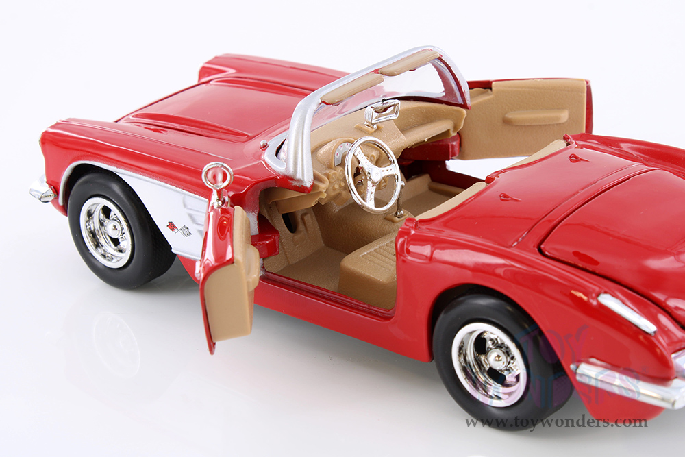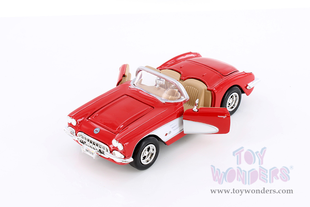 77216RD Showcasts® Collectibles - 1959 Chevy® Corvette® Convertible. 1:24 scale diecast collectible model car. This 1959 Chevrolet® Corvette® muscle car is a 7.25"L x 3"W x 2.25"H diecast metal car with workable steering, freewheeling, openable doors and hood. 4 pcs per display box and in red color.
