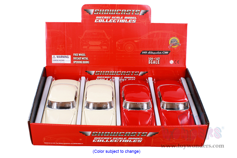 77302D Showcasts® Collectibles - 1955 Chrysler C300 Hardtop. 1:24 scale diecast collectible model car. This Chrysler C-300 measures 9"L x 3"W x 2.5"H diecast classic car with steerable front wheels, openable doors, hood, and trunk. 4 pcs per display box in assorted colors. GM is a trademark of the General Motors Corporation.