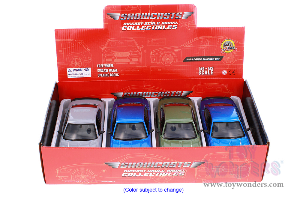 77387DB Showcasts® Collectibles - 2023 Dodge Charger SXT Hardtop. 1:24 scale diecast collectible model car. This Dodge Charger is an 8.25"L x 3"W x 2.5"H diecast metal car with free wheeling and openable doors. 4 pcs per display box. 77387DB is in assorted colors.