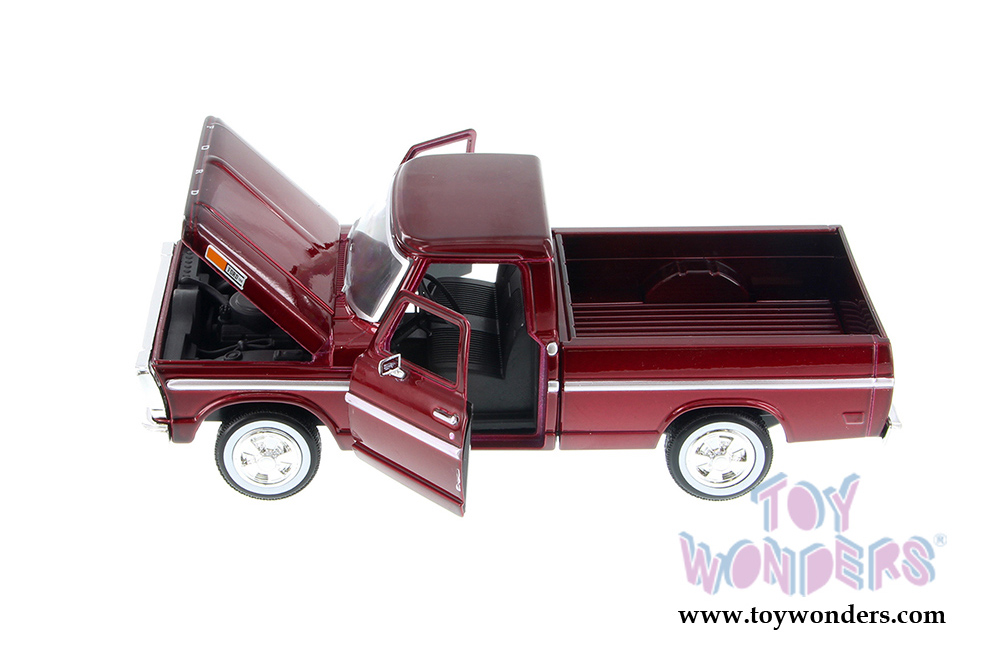 79315AC/BG Showcasts Collectibles - 1969 Ford F-100 Pickup truck. 1:24 scale diecast collectible model car. This 69 Ford F100 pick-up measures 8"L x 3.25"W x 3"H diecast classic car with openable doors & hood. This 69 Ford F 100 pick up is manufactured by Motor Max Toys for Showcasts Collectibles. 79315AC/BG is in BURGUNDY. Individually packed in a window box WB. Box size: 9.75"Lx 4.5"Wx 4"H.