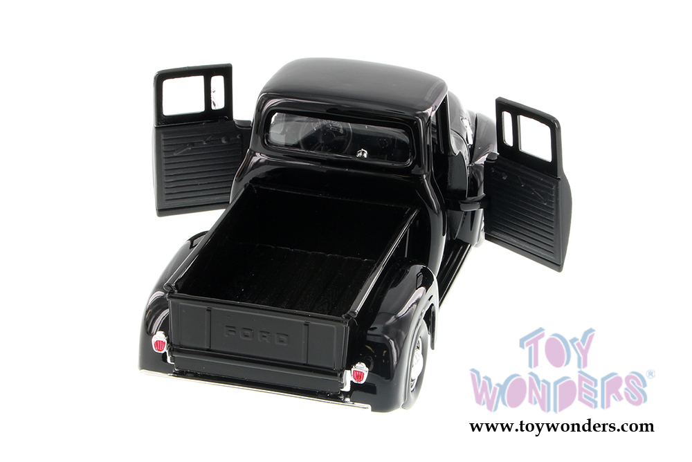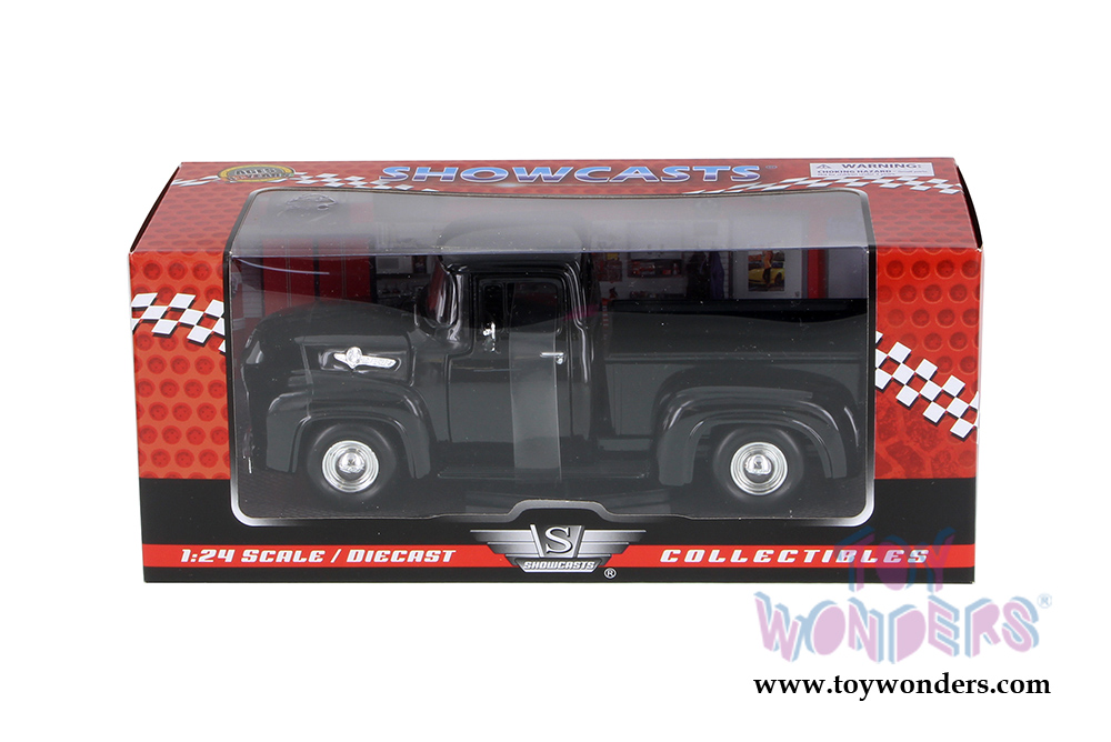 73235AC/BK Showcasts Collectibles - 1956 Ford F-100 Pickup. 1:24 scale diecast collectible model car. This Ford F100 is a 7.5"L x 2.5"W x 2"H diecast metal car with freewheeling, steerable front wheels, openable doors, hood, and trunk. Individually packed in a window box. Window Box measures 9.5"L x 4.25"W x 4"H. The Ford Pickup is manufactured by Motor Max for Showcasts Collectibles. 73235AC/BK is in BLACK.