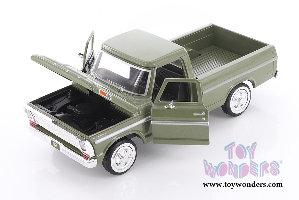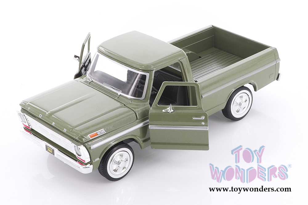 79315/41D Showcasts Collectibles - 1955 and 1969 Ford F-100 Pickup trucks. 1:24 scale diecast collectible model car. The 1955 Ford F100 is a 7.75"L x 3.5"W x 3.25"H. The 1969 Ford F100 is an 8"L x 3.25"W x 3"H diecast metal pickup truck with openable doors, and hood. These Ford F 100 pickup trucks are manufactured by Motormax for Showcasts Die-cast Collectibles. 4 pcs per display box in assorted colors.