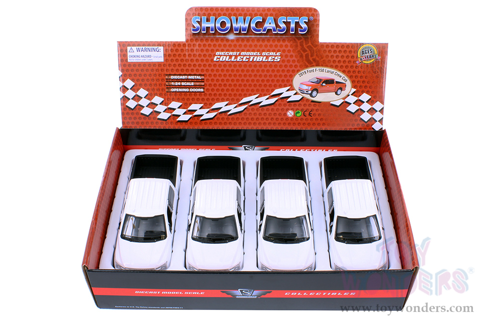 79363WH/16D Showcasts Collectibles - 2019 Ford F-150 Lariat Crew Cab Pickup Truck. 1:27 scale diecast collectible model car. This Ford F-150 Pickup is an 8.5"L x 3.75"W x 2.75"H diecast metal with freewheeling and openable doors with folding side mirrors. 4 pcs per display box in white. This 2019 Ford F150 Pickup is manufactured by Motormax for Showcasts Collectibles.