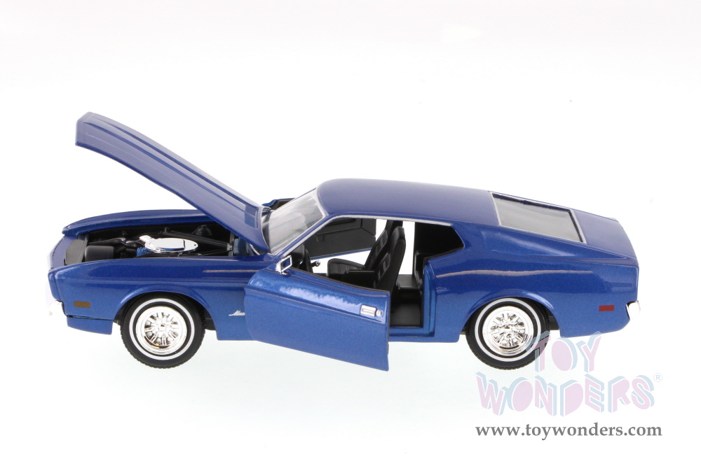 73327/16D Showcasts Collectibles - 1971 Ford Mustang Sportsroof. 1:24 scale diecast collectible model car. This 1971 Ford Mustang is a 7.25"L x 3"W x 2.25"H diecast metal convertible with workable steering, openable doors and hood. This '71 Ford Mustang Sportsroof is manufactured by Motormax for Showcasts. 4 pcs per display box. 73327/16D is in assorted colors.