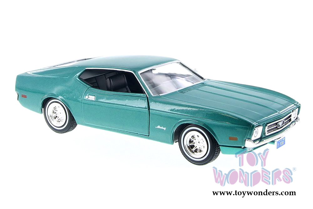 73327AC/GN Showcasts Collectibles - 1971 Ford Mustang Sportsroof Hardtop. 1:24 scale diecast collectible model car. This Ford Mustang measures 7.5"L x 2.75"W x 1.75"H diecast classic car with openable doors and hood. This 71 Ford Mustang sports car is manufactured by Motor Max Toys for Showcasts Collectibles. 73327AC/GN is in GREEN color. Individually packed in a window box. Window Box size: 9.75"L x 4.3"W x 4"H.