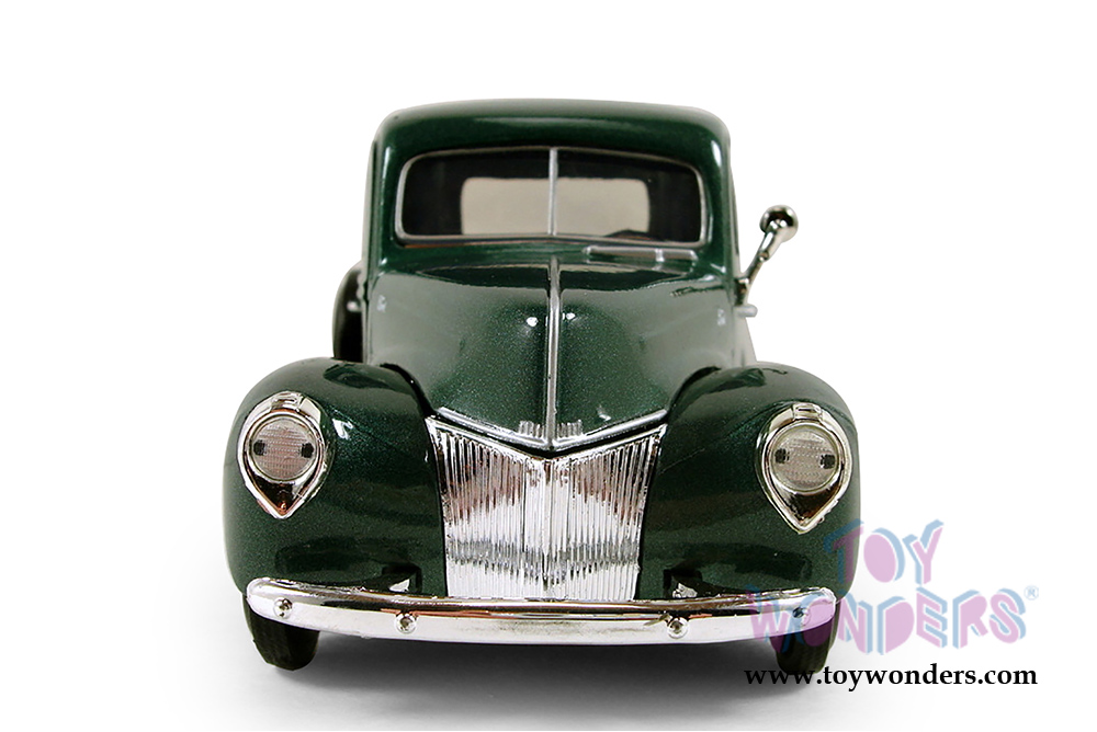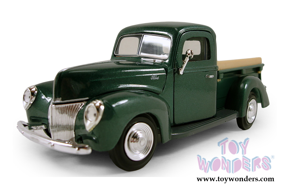 73234AC/GN Showcasts Collectibles - 1940 Ford Pickup truck. 1:24 scale diecast collectible model car. This 1940 Ford is a 7.5"L x 3"W x 3"H diecast metal pickup truck with openable doors, hood, and workable steering. This 1940 Ford Pickup Truck is manufactured by Motormax for Showcasts Collectibles. 73234AC/GN is in GREEN color. Individually packed in a window box. Window Box size: 9.75"L x 4.5"W x 4"H.