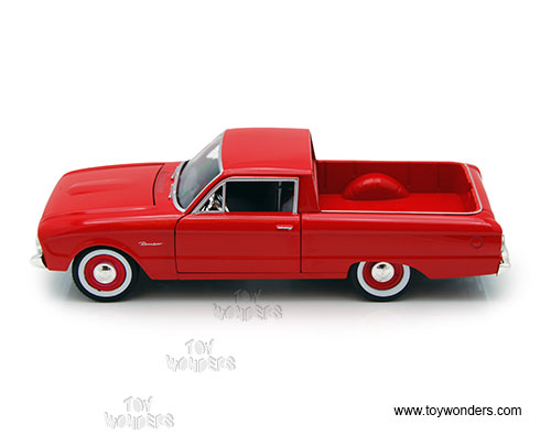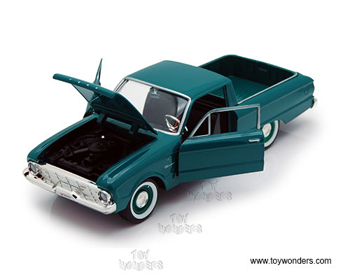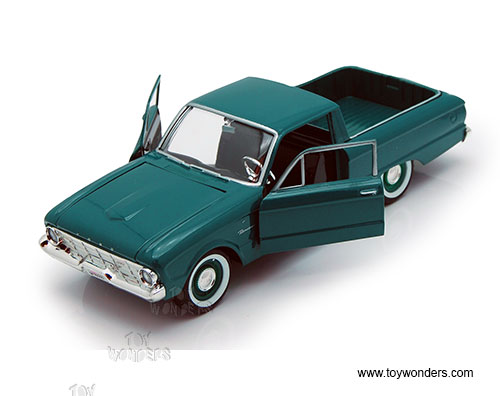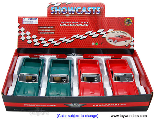 79321/16D Showcasts Collectibles - 1960 Ford Ranchero Pickup Truck. 1:24 scale diecast collectible model car. This Ford Ranchero is a 7.75"L x 2.75"W x 2.25"H diecast metal car with freewheeling, openable doors, and hood. The Ford Ranchero is manufactured by Motormax for Showcasts Collectibles. 4 pcs per display box. 79321/16D is in assorted colors.