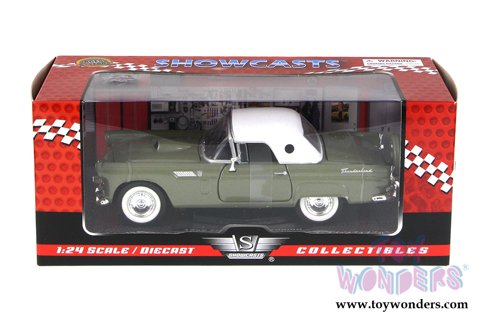 73312AC/GN Showcasts Collectibles - 1956 Ford Thunderbird Closed Convertible. 1:24 scale diecast collectible model car. This Ford Thunderbird measures 7.25"L x 3"W x 2"H diecast classic car with openable doors, hood, trunk, steerable front wheels. This 1956 Ford Thunderbird is manufactured by Motor Max Toys for Showcasts Collectibles. 73312AC/GN is in GREEN color. Individually packed in a window box. Window Box size: 9.75"L x 4.5"W x 4"H.