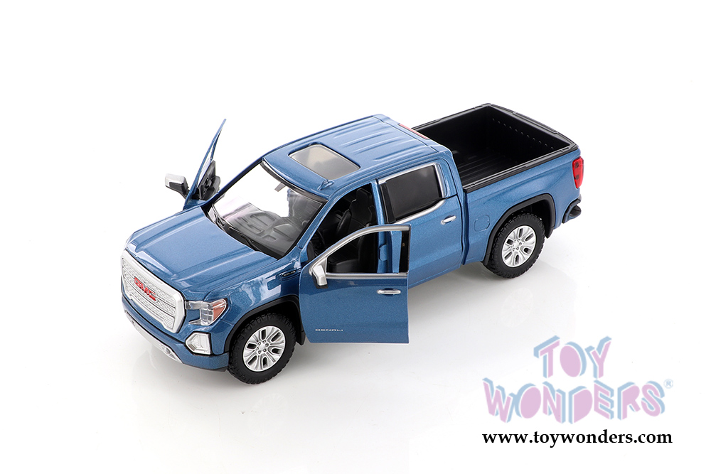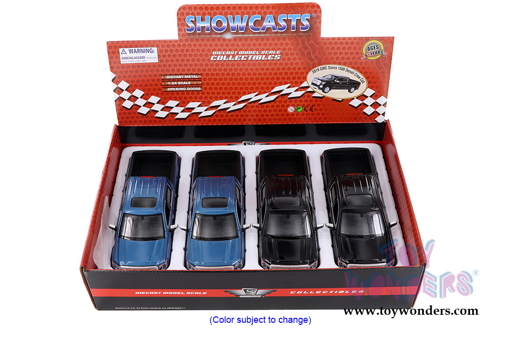 79362/16D Showcasts Collectibles - 2019 GMC® Sierra 1500 Denali Crew Cab Pickup Truck. 1:27 scale diecast collectible model car. This GMC® Pickup is an 8.5"L x 3.75"W x 2.75"H diecast metal with freewheeling and openable doors. 4 pcs per display box in assorted colors. This 2019 GMC® Pickup is manufactured by Motormax for Showcasts Collectibles.