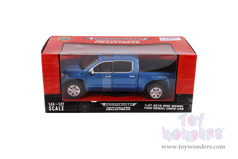 71362BU Showcasts® Collectibles - 2019 GMC® Sierra 1500 Denali Crew Cab Pickup Truck. 1:27 scale diecast collectible model car. This GMC® Pickup is an 8.5"L x 3.75"W x 2.75"H diecast metal with freewheeling and openable doors. Individually packed in a window box. Window Box measures 9.5"Lx 4.25"Wx 4"H. 71362BU is in blue color.