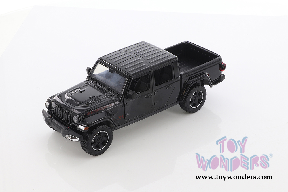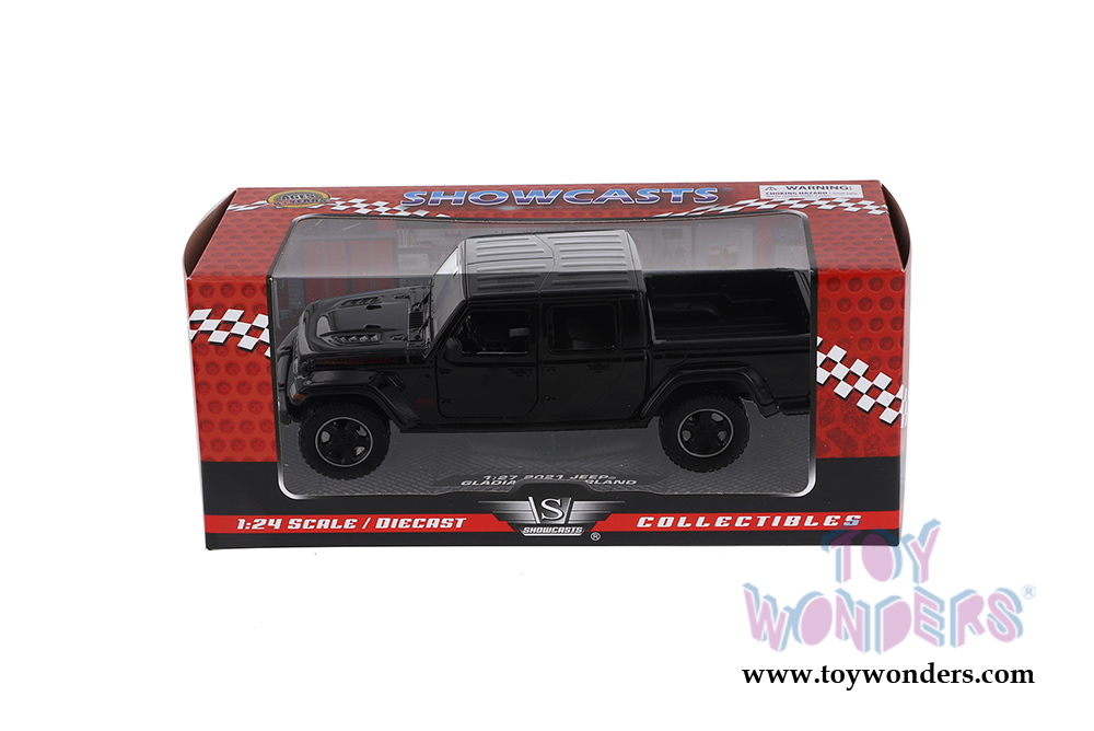 79368BK Showcasts Collectibles - 2021 Jeep® Gladiator Rubicon Pickup Truck. 1:24 scale diecast collectible model car. This Jeep® Gladiator is an 8"L x 2.75"W x 2.75"H diecast metal car with freewheeling, openable doors. This 2021 Jeep® vehicle is manufactured by Motormax for Showcasts Collectibles. 79368BK is in Black. Individually packed in a window box. Box size: 9.75"L x 4.25"W x 4"H.