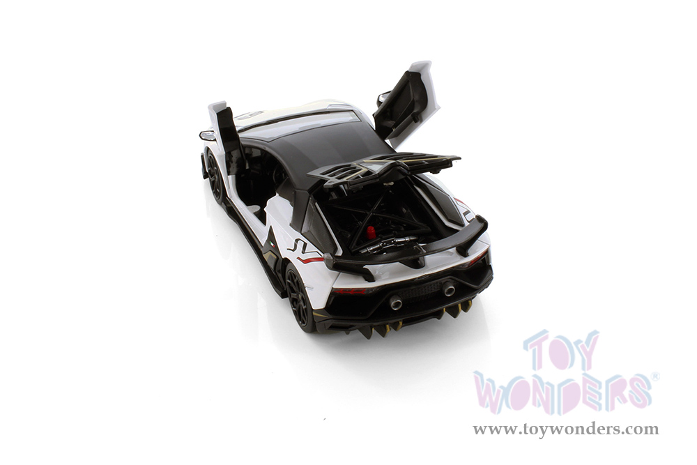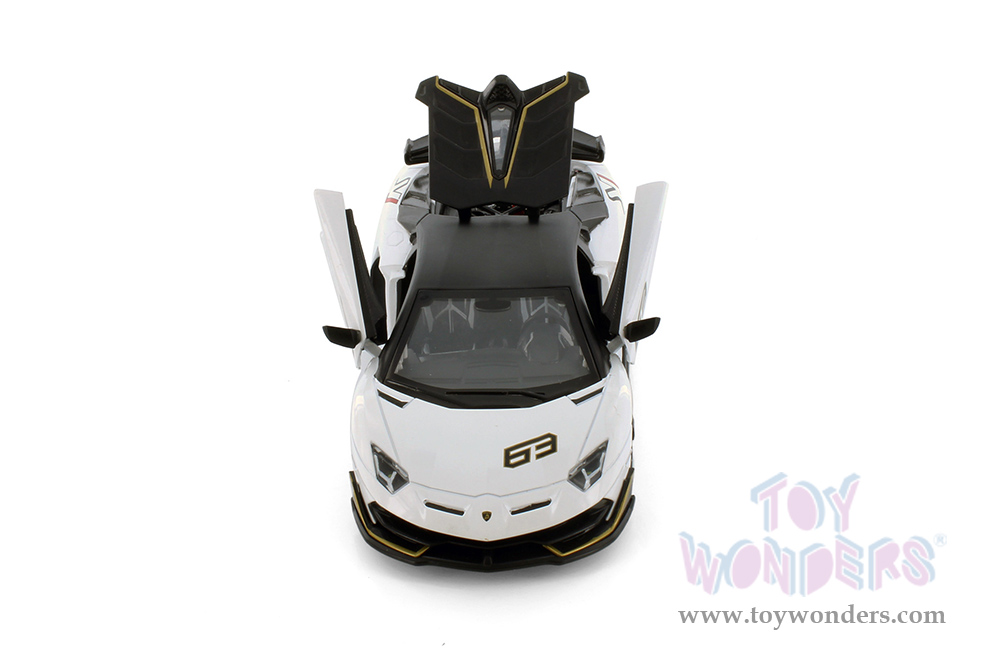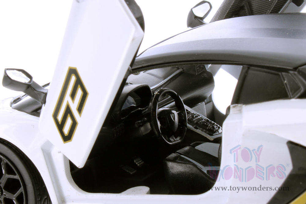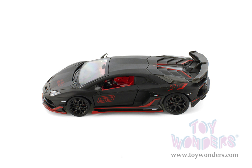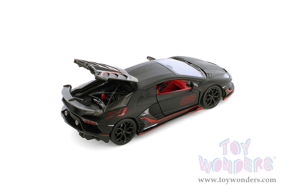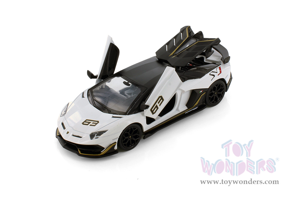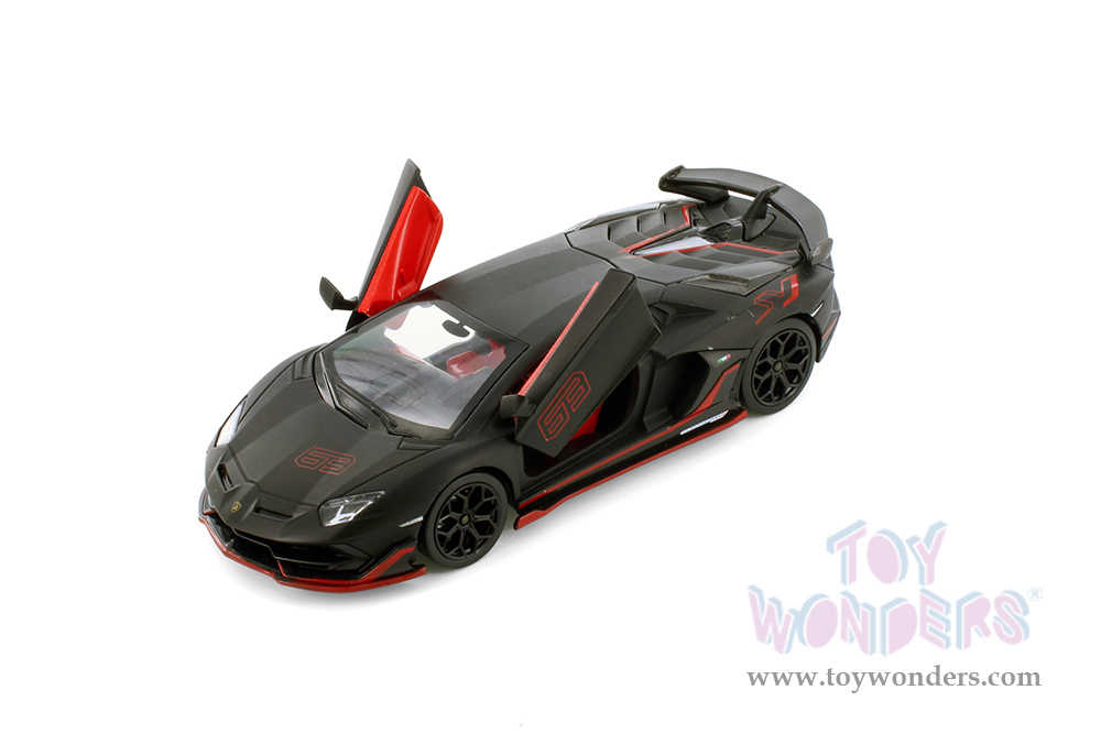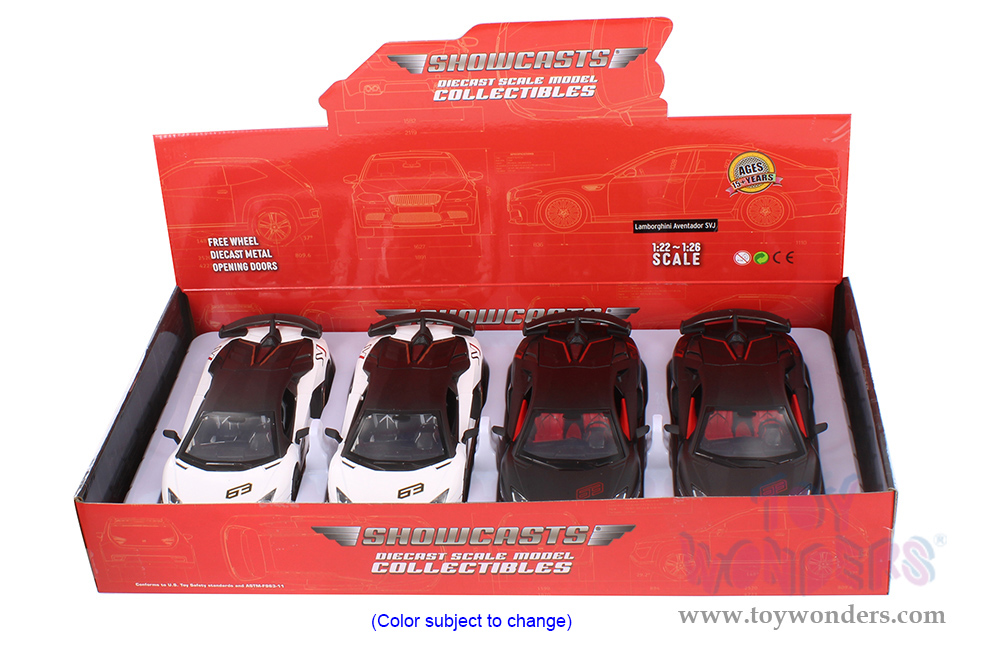 68269D Showcasts® Collectibles - Lamborghini Aventador SVJ. 1:24 scale diecast collectible model car. This Lamborghini Aventador is an 8"L x 3.25"W x 2"H die-cast metal car with freewheeling. Openable doors, and engine compartment. Italian design. This Lamborghini is manufactured by MSZ Toys for Showcasts. 4 pcs per display box in assorted colors.