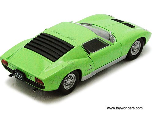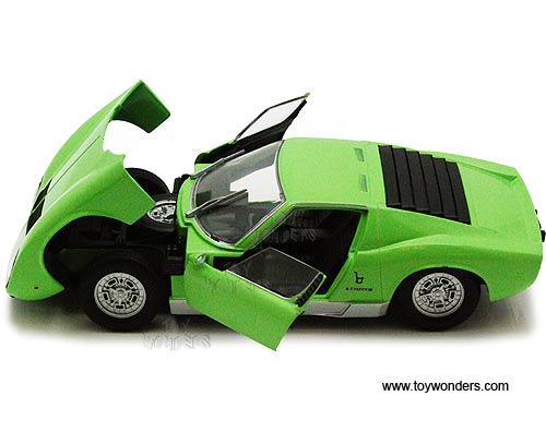 73368/16D Showcasts Collectibles - Lamborghini Miura P 400 S Hard Top. 1:24 scale diecast collectible model car. This Lamborghini Miura P400-S measures 7"L x 2.75"W x 1.75"H diecast classic car with openable doors & hood. This Lamborghini Miura P400-S is manufactured by Motor Max Toys for Showcasts Collectibles. 4 pcs per display box in GREEN color. Motor Max.
