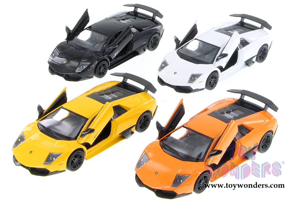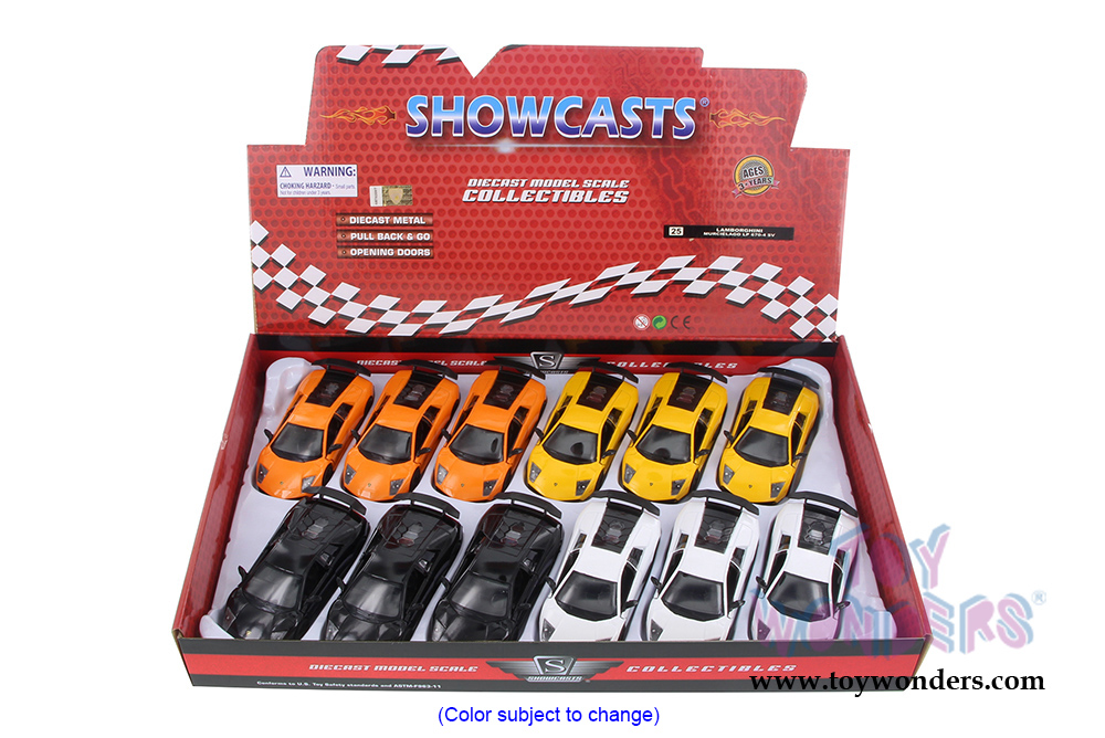555997 Showcasts Collectibles - Lamborghini Murcielago LP 670-4 Hard Top. 5" scale diecast collectible model car. This Lamborghini is a 5"Lx 2"Wx 1.25"H die cast metal car with openable doors and pullback action. This Lamborghini Murcielago is manufactured by Uni-Fortune for Showcasts Collectibles. 12 pcs per display box in assorted colors. 48 pcs per inner box.