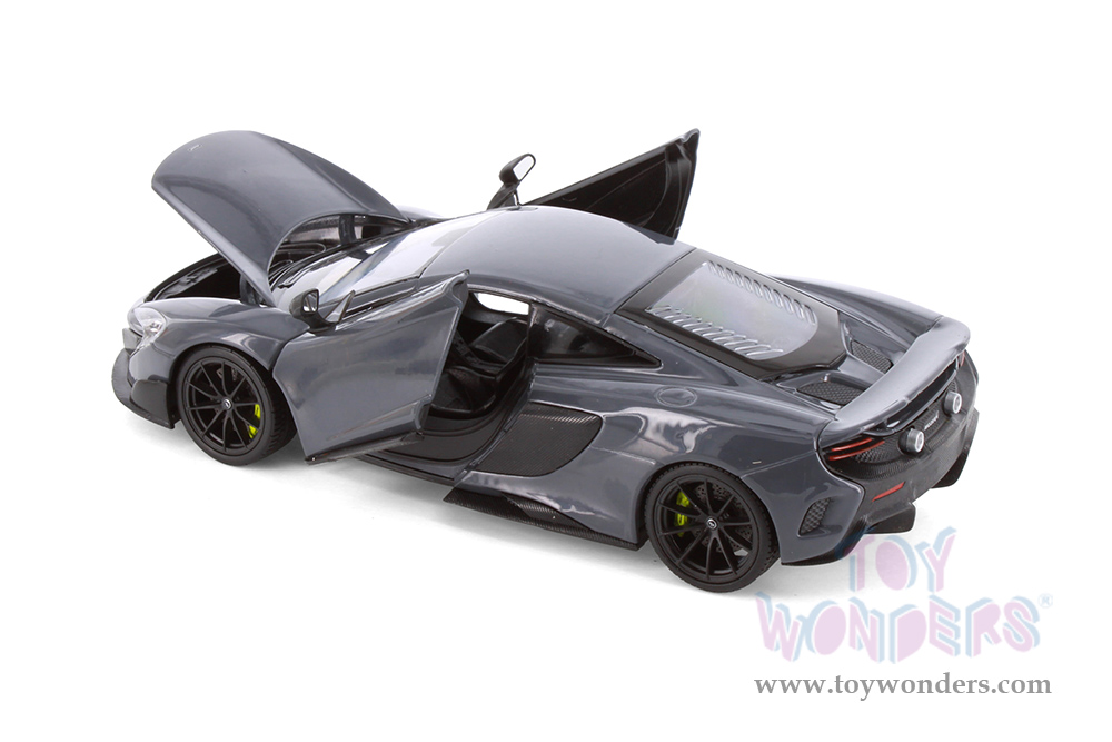 24089/4D Showcasts® Collectibles - McLaren 675LT Coupe. 1:24 scale diecast model car. This McLaren is a 7.5"L x 3"W x 2"H diecast metal classic muscle car with opening doors and hood. Poseable steering. 4 pcs per display box and in assorted colors. 24 pcs per inner box.